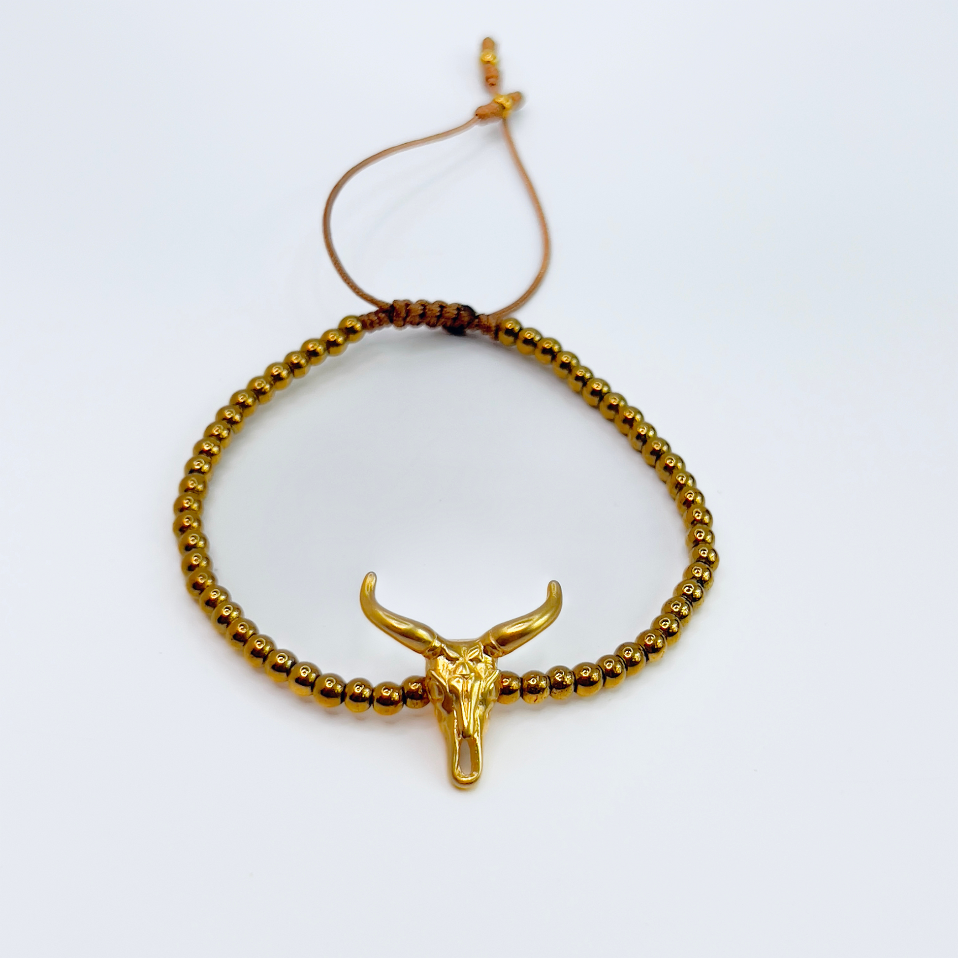 Handcrafted with metallic gold hematite-style beads, this bracelet reflects light and intention while helping ground your energy. At the center, a golden longhorn skull charm honors the sacred spirit of the West — a symbol of resilience, ancestral wisdom, and rooted power. Finished with a minimalist brown cord for comfort and adjustability.