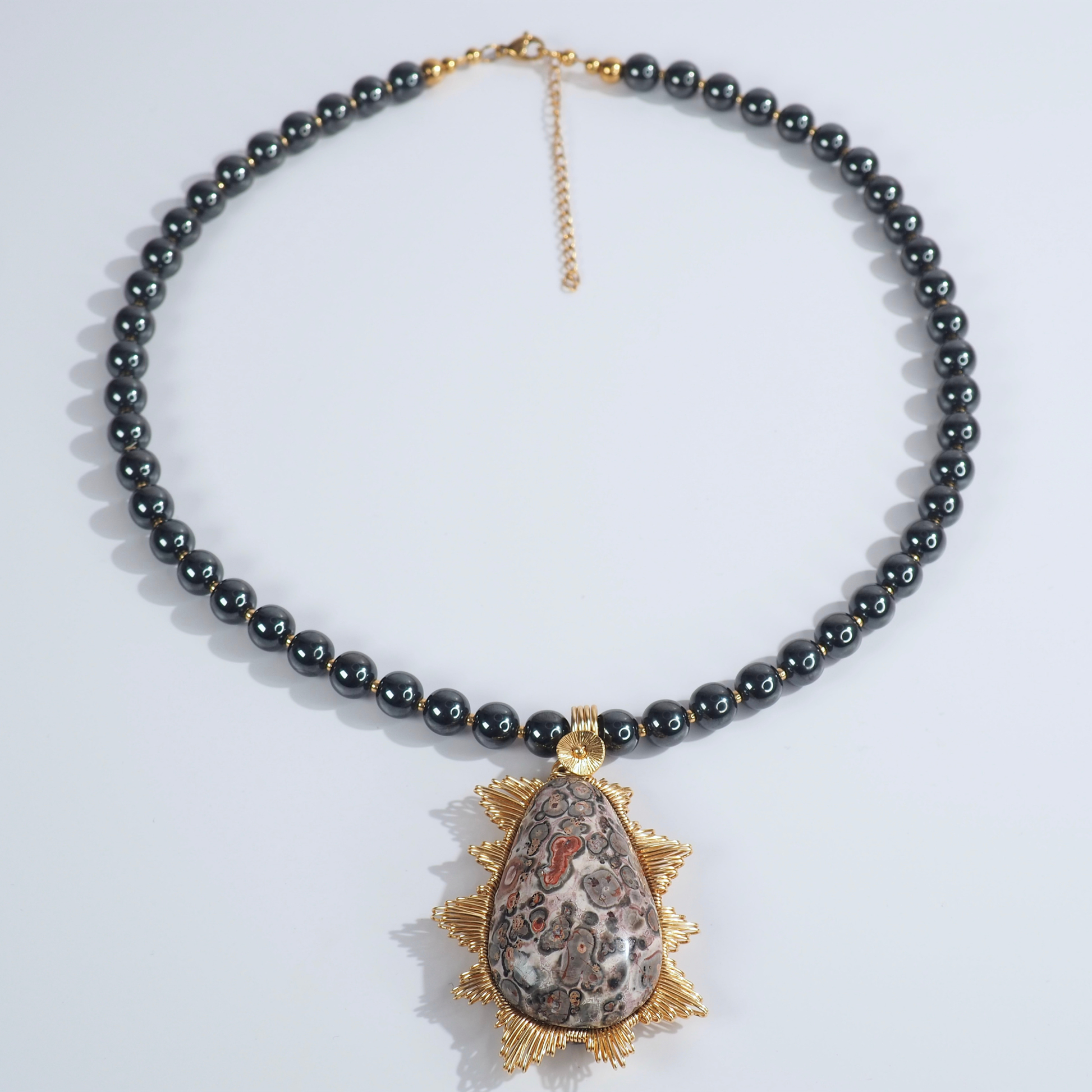 Bold yet refined, the SoulJewls “Sol Salvaje” Necklace blends the grounding strength of hematite with the raw beauty of leopard jasper, hand-wrapped in a radiant golden sunburst design.